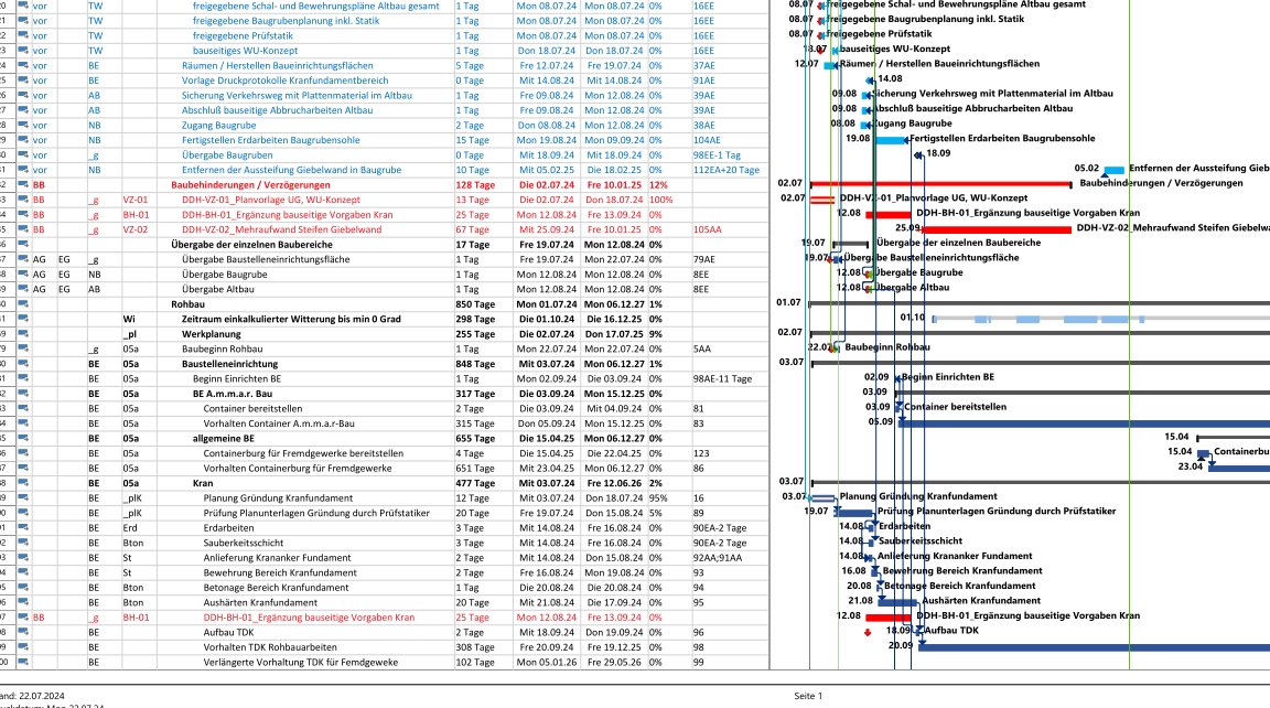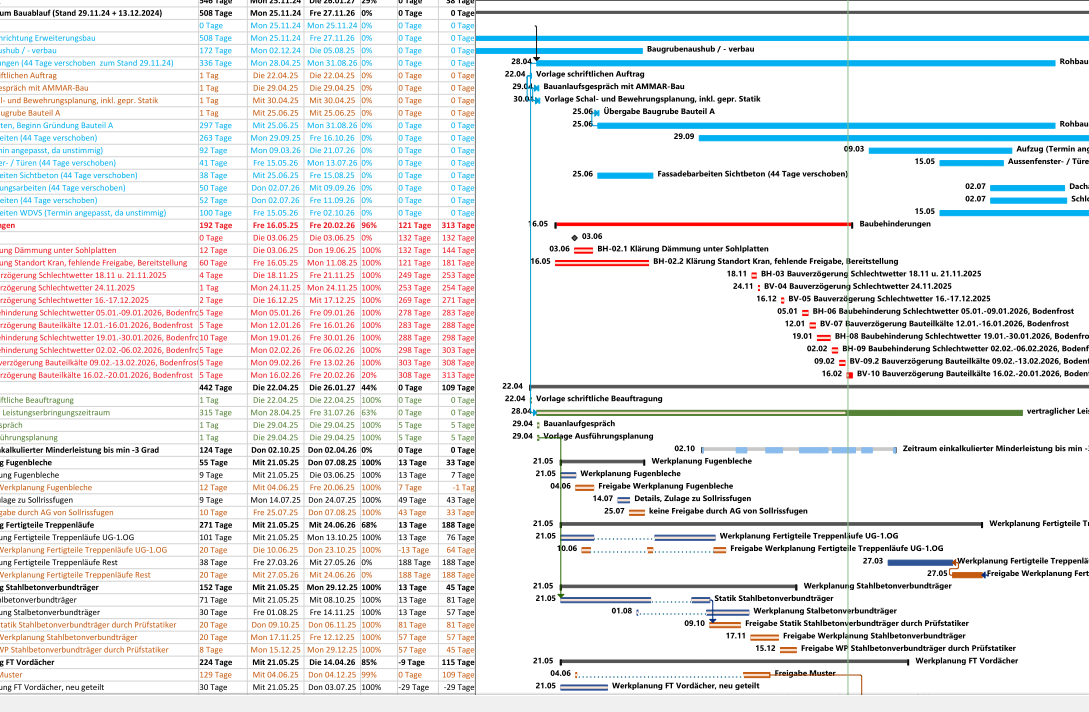 Diese Grundlage ermöglicht es, spätere Bauzeitverlängerungen und Bauablaufstörungen nachvollziehbar darzustellen und dient zugleich der Absicherung gegenüber möglichen Vertragsstrafen wegen Terminüberschreitungen.